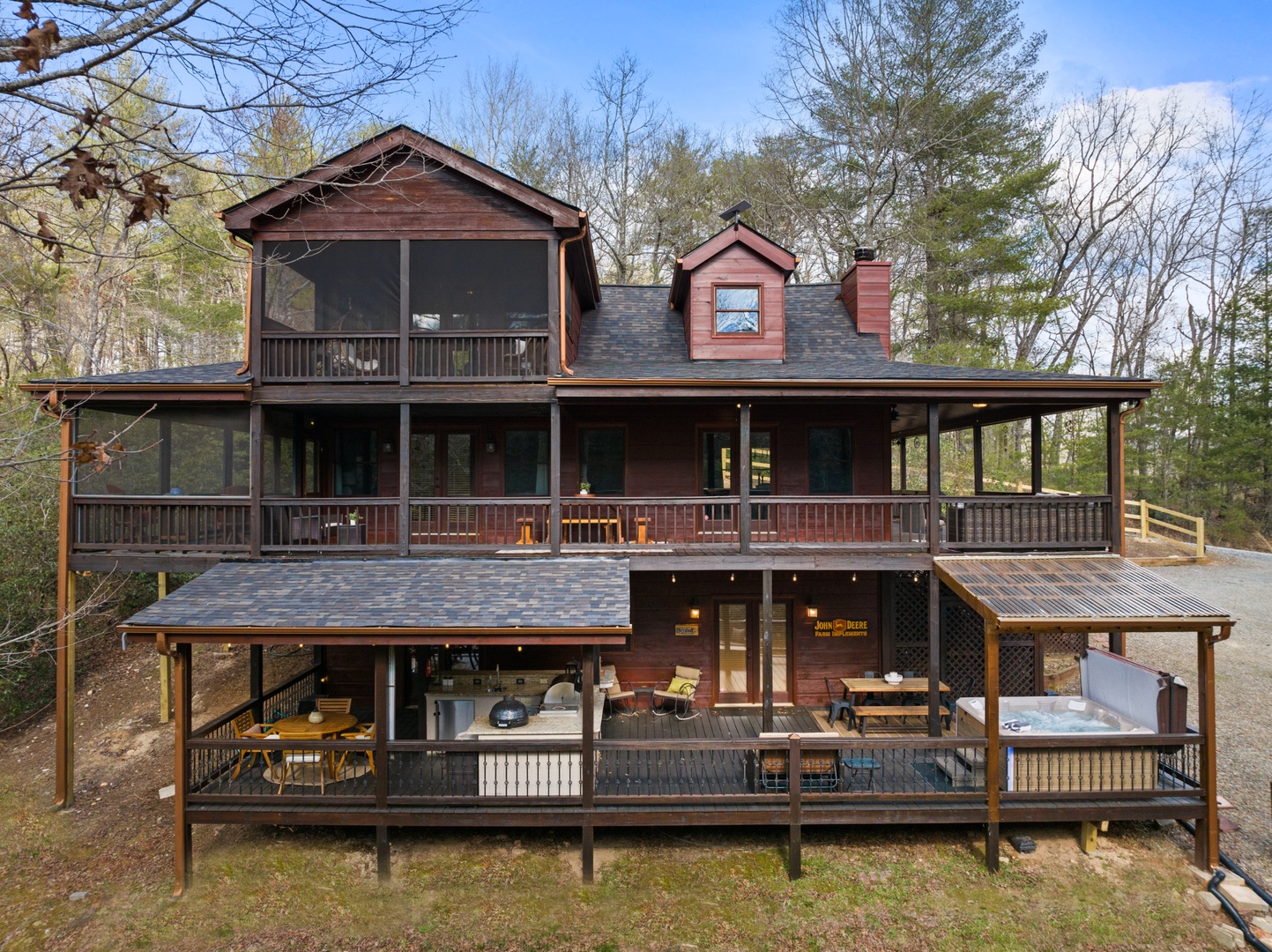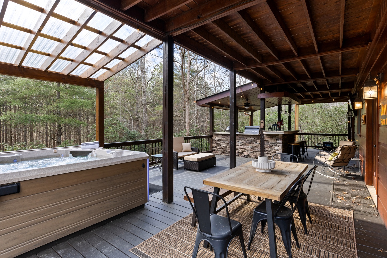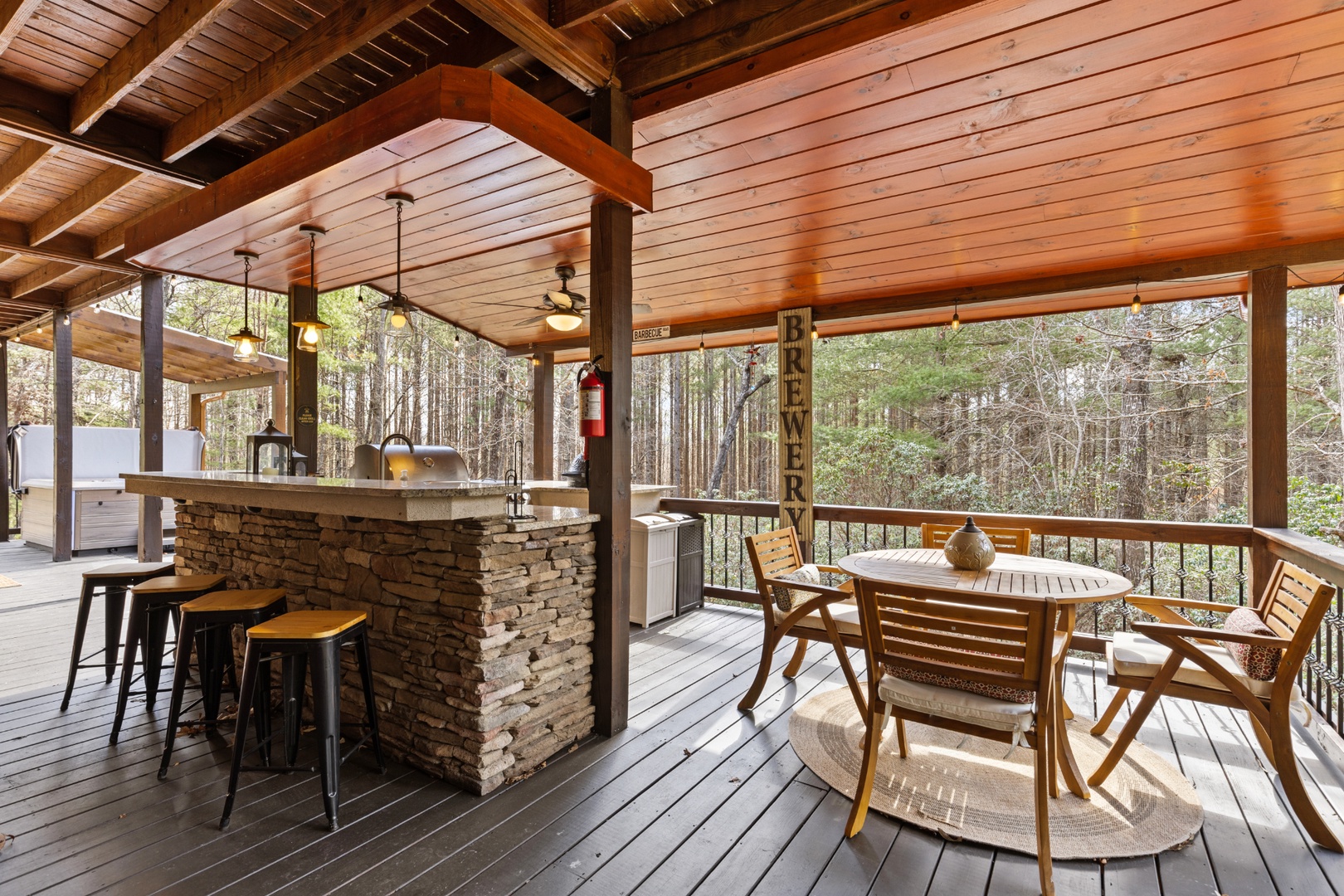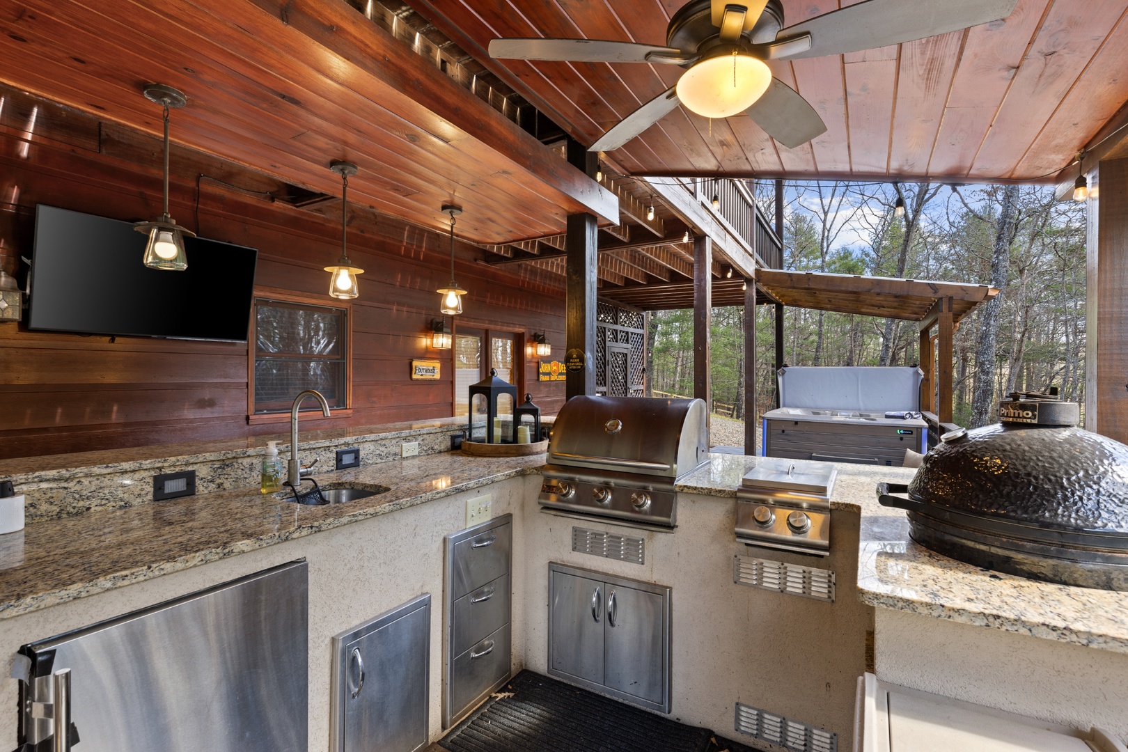 Outside, mountain living unfolds at every turn. The expansive wraparound porch offers seating in literally every direction — morning coffee, afternoon reading, evening wine — your choice. Enjoy the screened porch dining area, a fully equipped outdoor kitchen with both propane and ceramic grills, a relaxing hot tub, and a comfortable fire pit perfect for long conversations under the stars.
