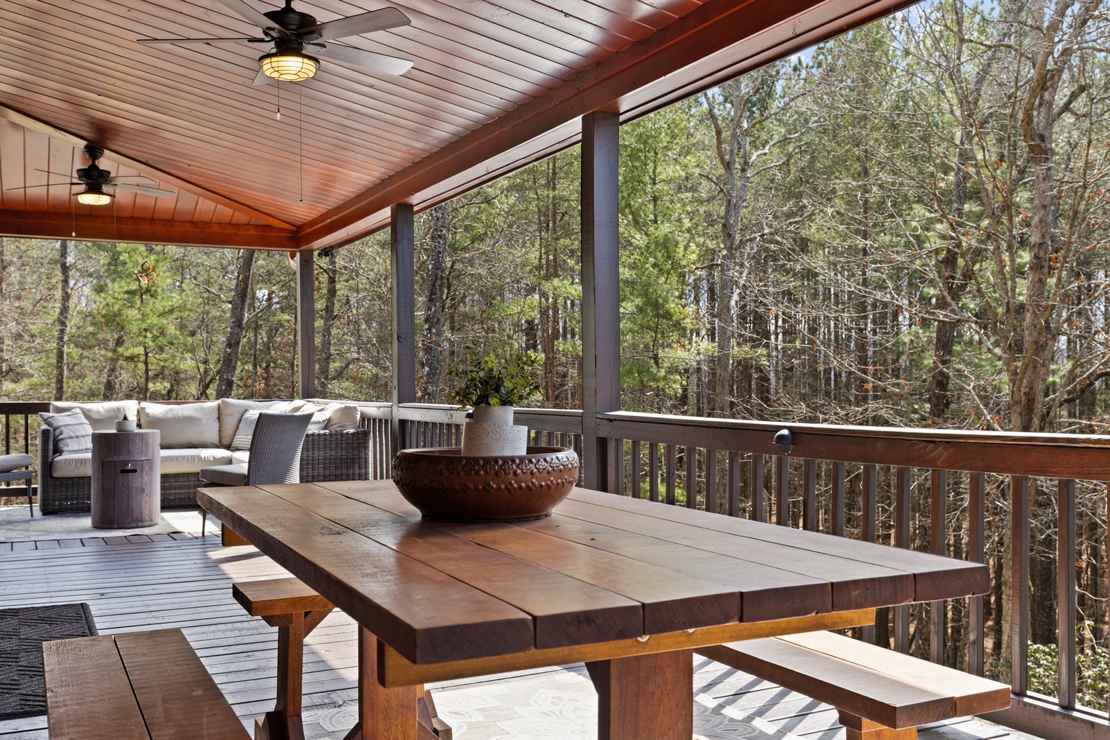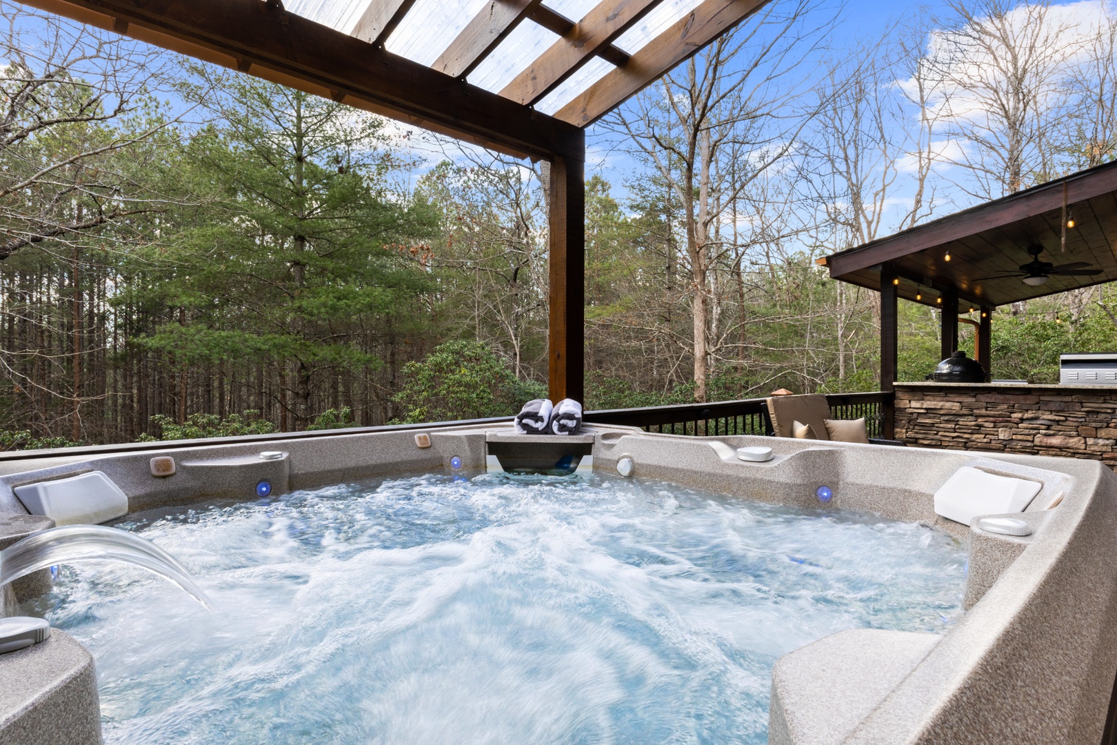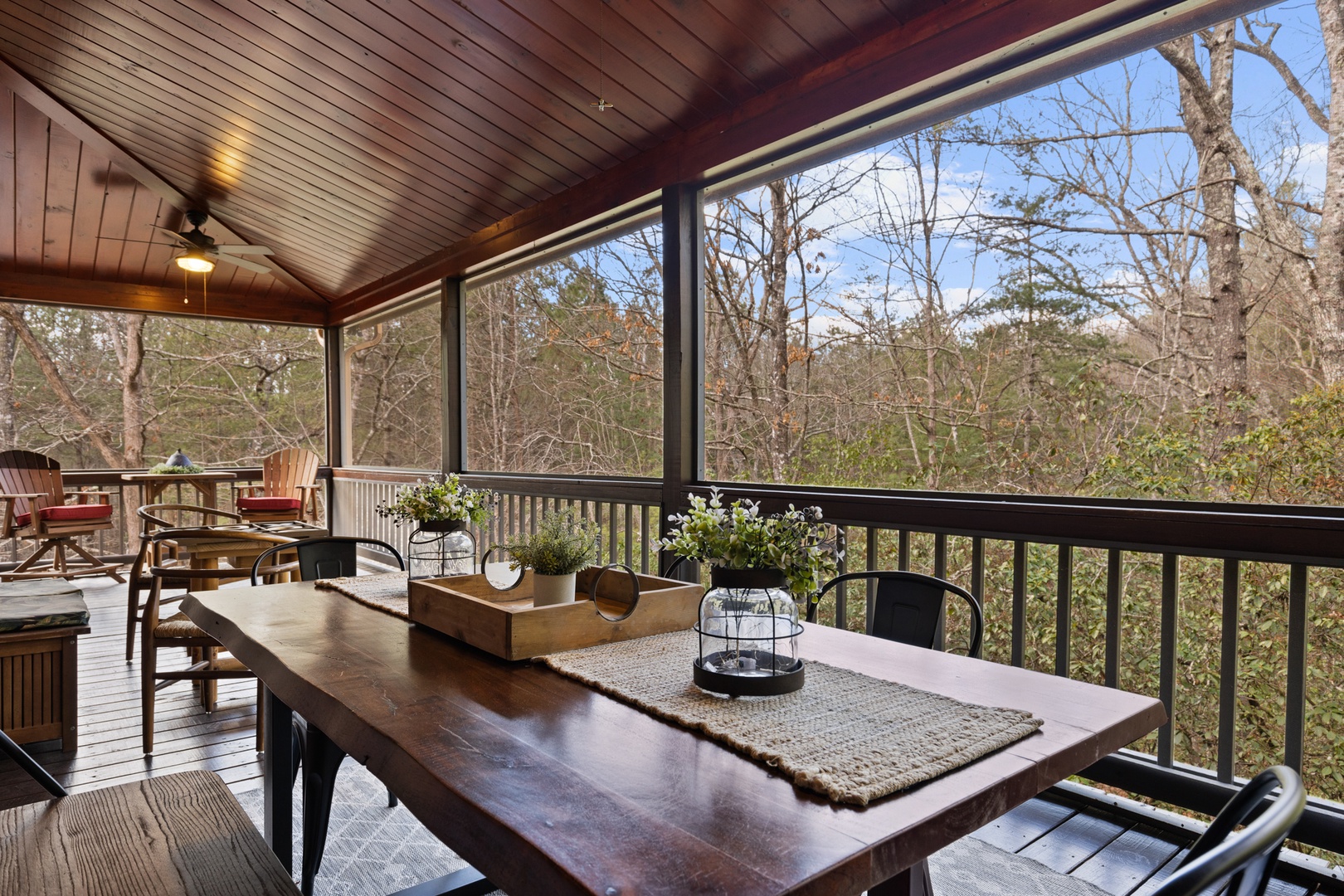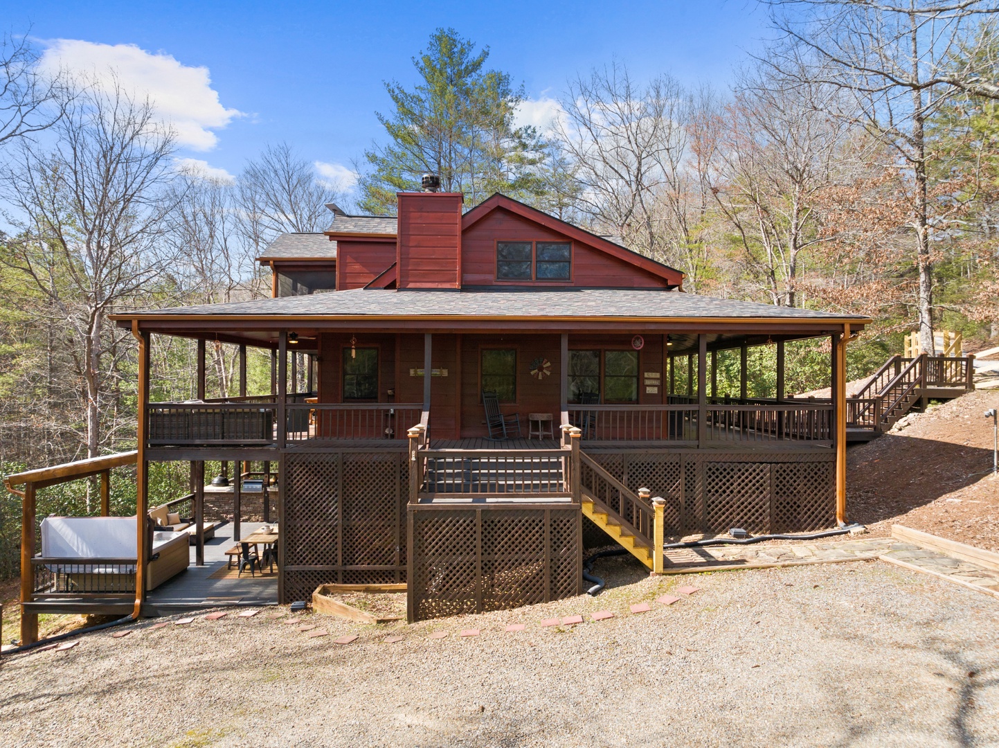 Outside, mountain living unfolds at every turn. The expansive wraparound porch offers seating in literally every direction — morning coffee, afternoon reading, evening wine — your choice. Enjoy the screened porch dining area, a fully equipped outdoor kitchen with both propane and ceramic grills, a relaxing hot tub, and a comfortable fire pit perfect for long conversations under the stars.