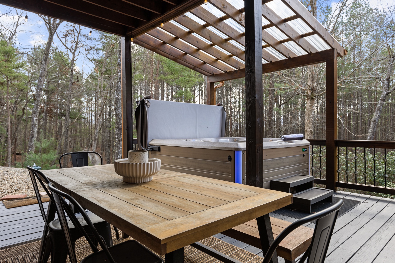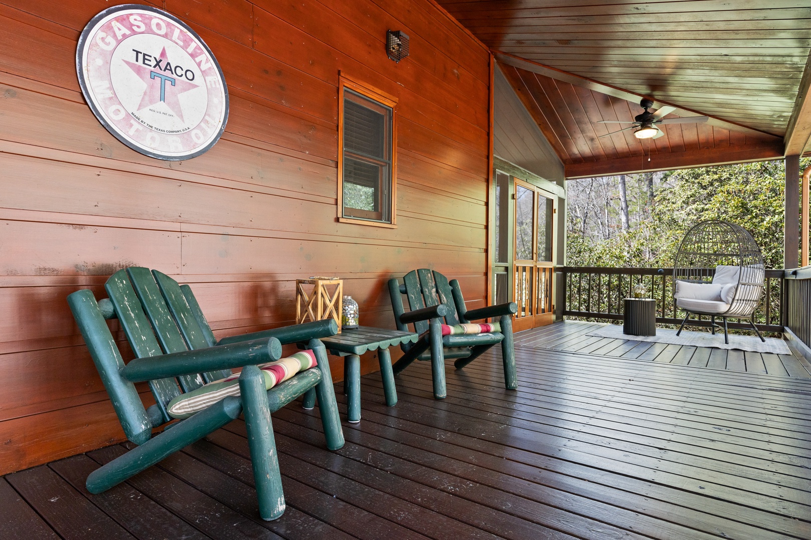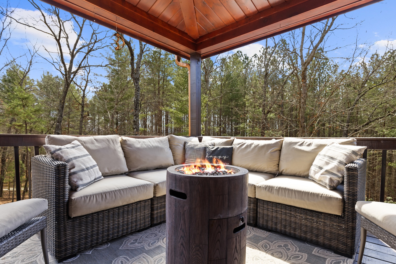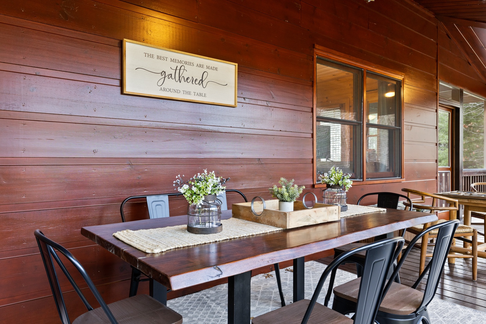 Outside, mountain living unfolds at every turn. The expansive wraparound porch offers seating in literally every direction — morning coffee, afternoon reading, evening wine — your choice. Enjoy the screened porch dining area, a fully equipped outdoor kitchen with both propane and ceramic grills, a relaxing hot tub, and a comfortable fire pit perfect for long conversations under the stars.