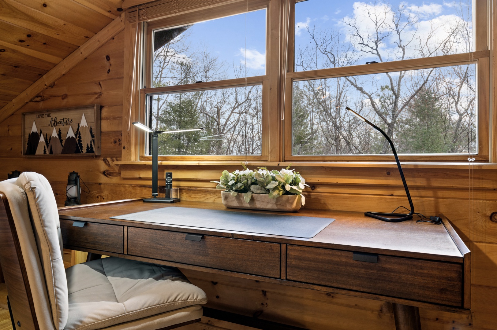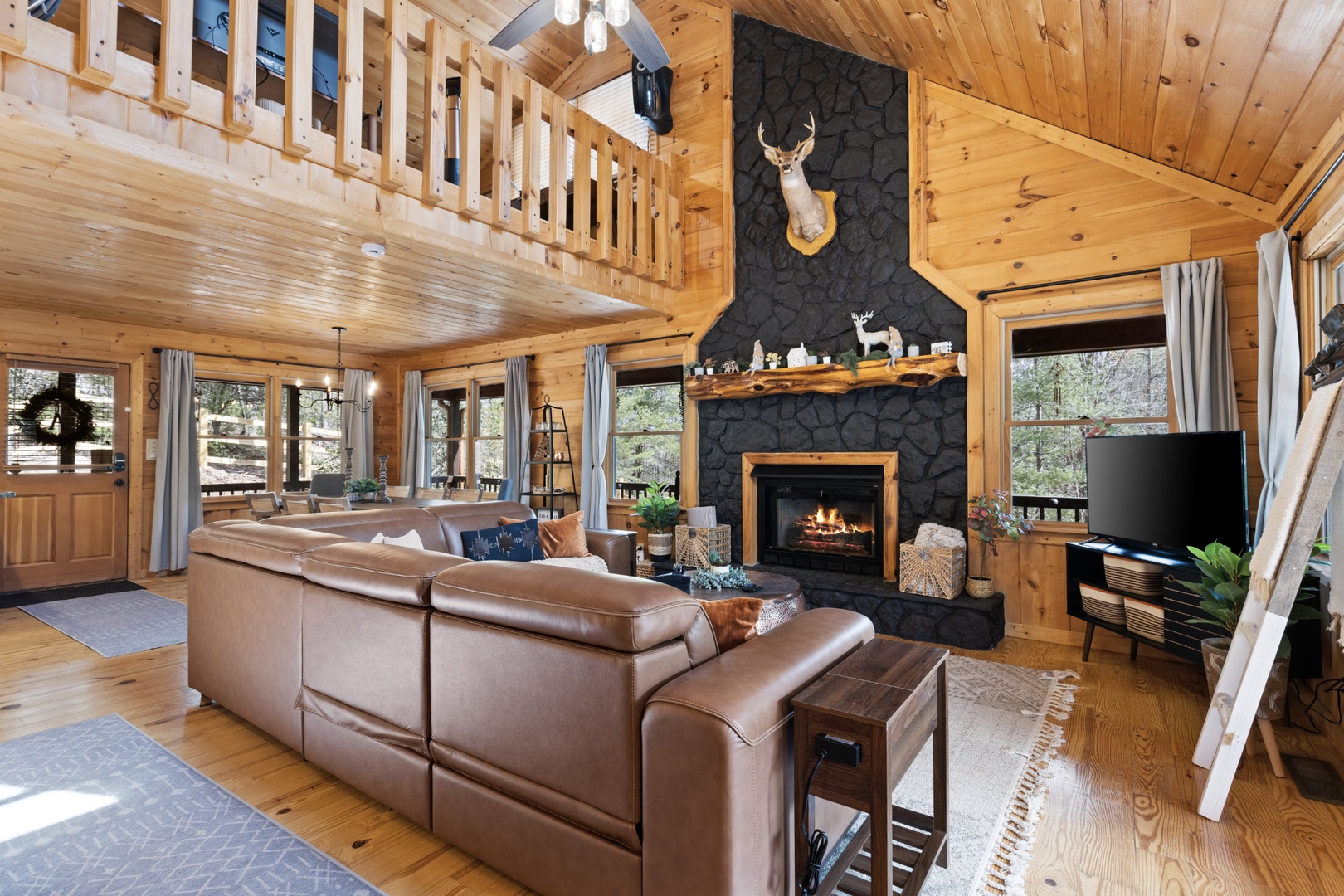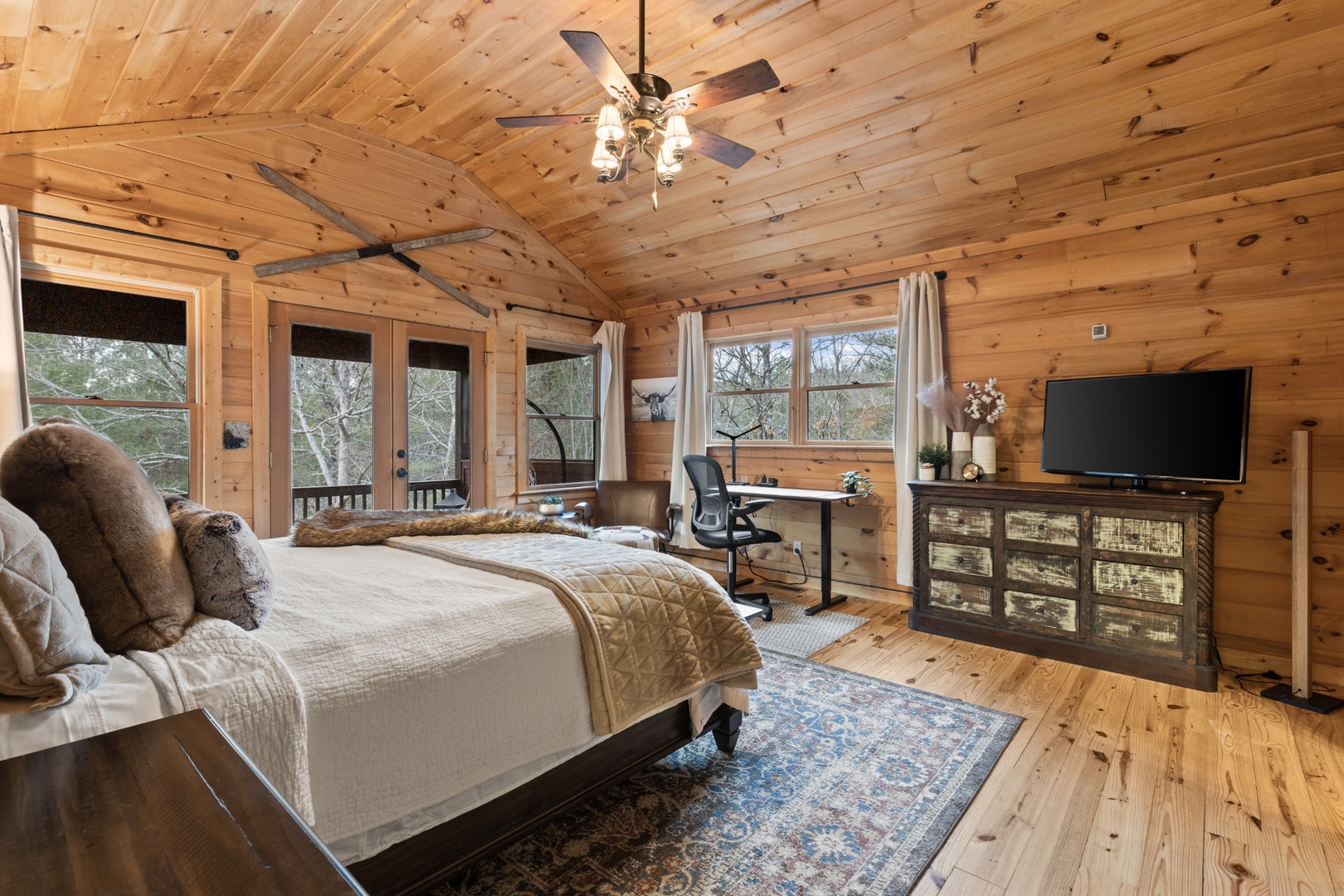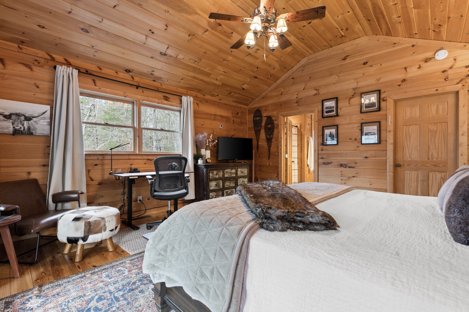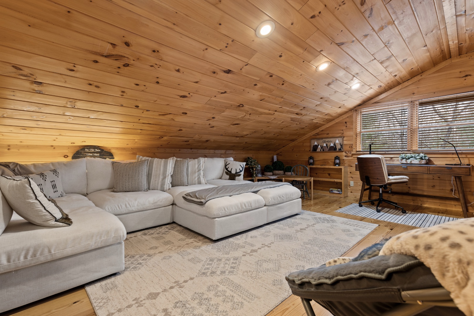 Inside, upscale furnishings and thoughtfully curated spaces create an elevated yet inviting atmosphere. Whether you’re planning a working retreat or simply want room to spread out, this cabin features FOUR dedicated workstations and dual high-speed internet — Starlink plus local service — ensuring a remarkably reliable connection for remote work, streaming, and video calls.
