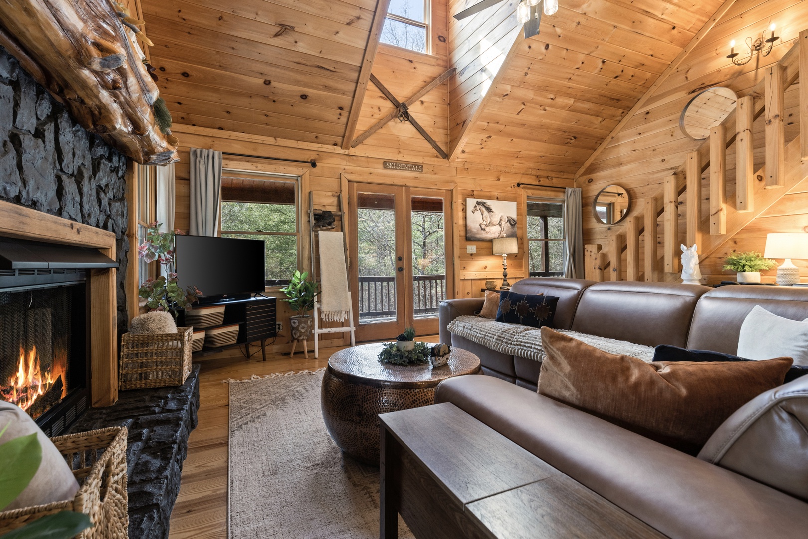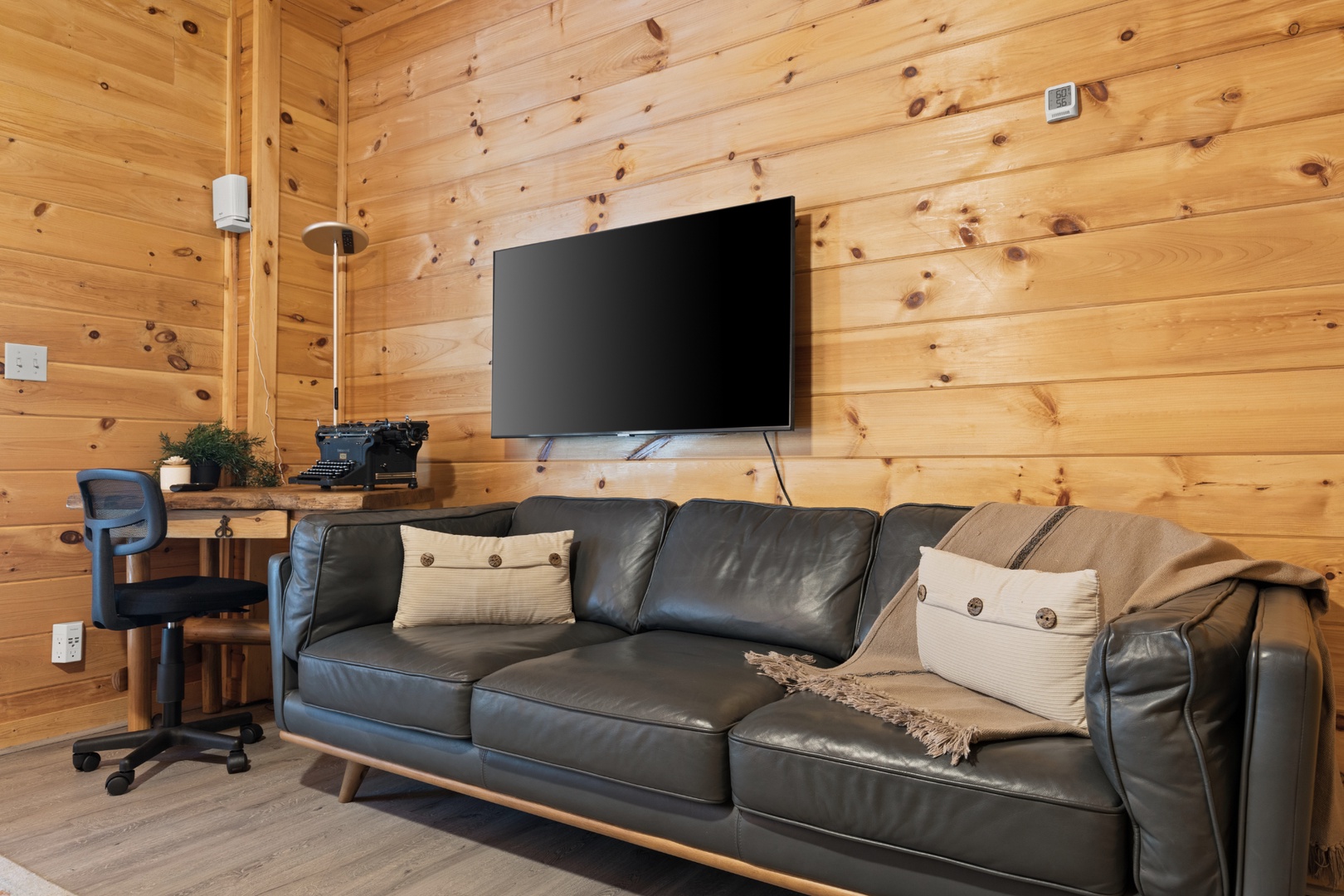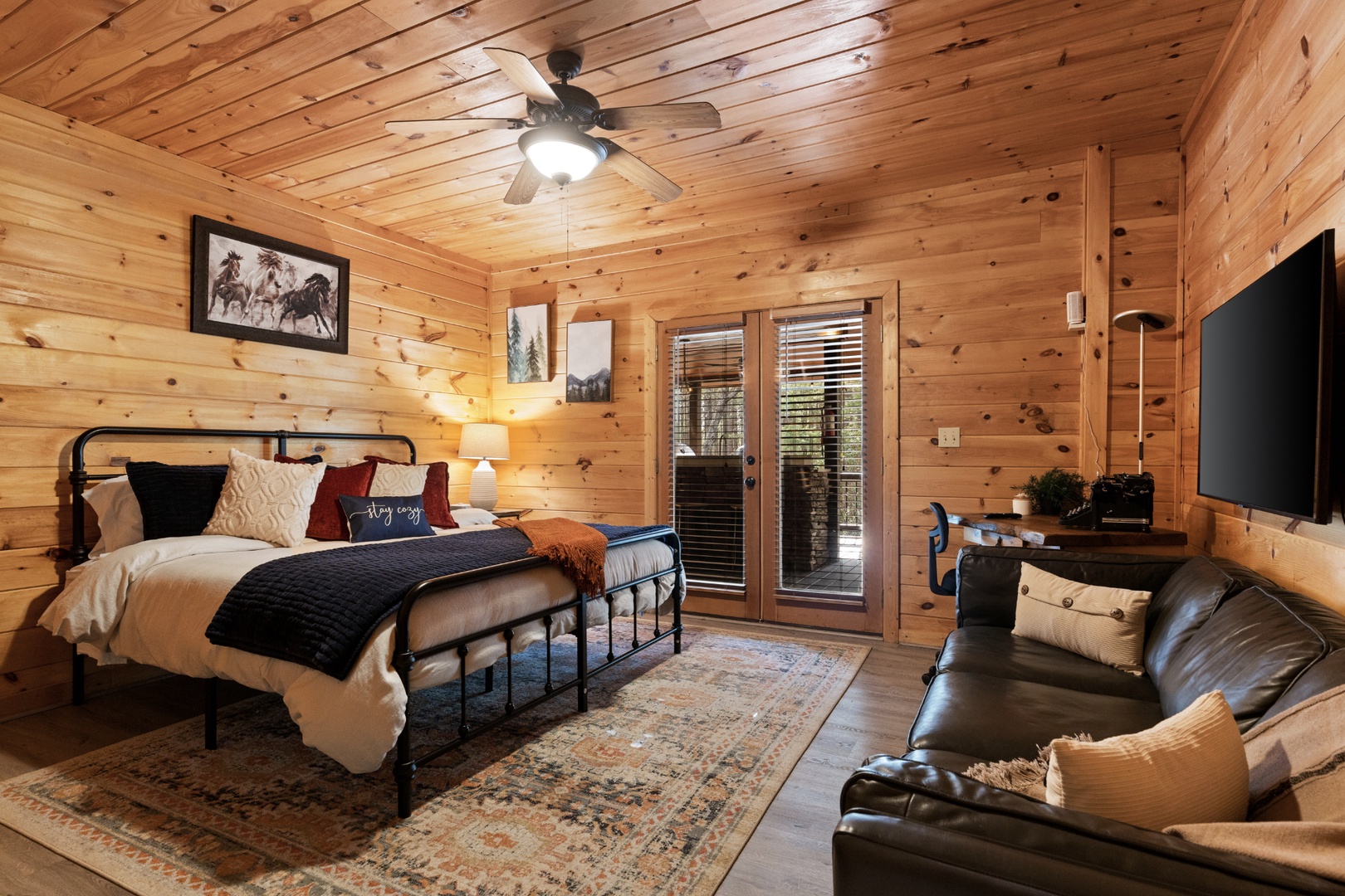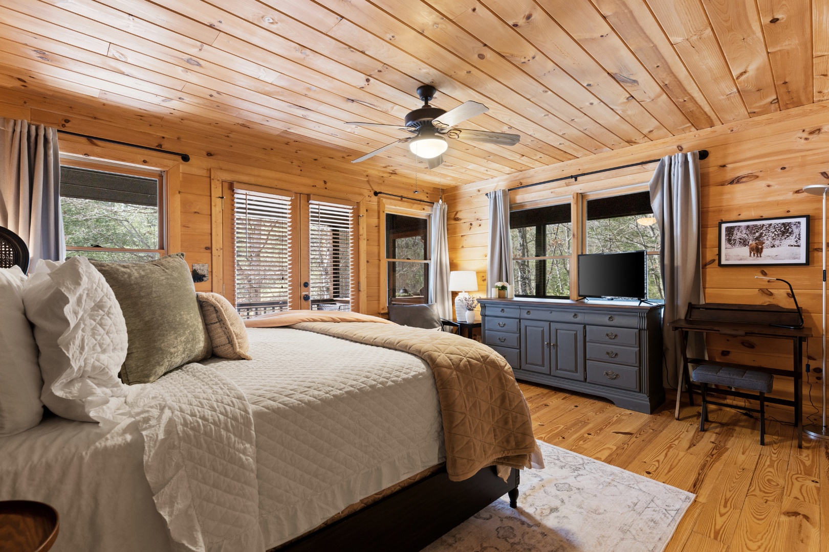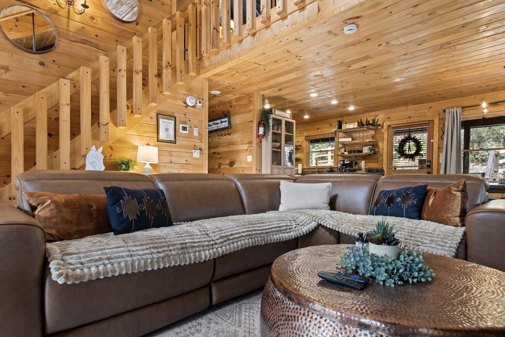 Inside, upscale furnishings and thoughtfully curated spaces create an elevated yet inviting atmosphere. Whether you’re planning a working retreat or simply want room to spread out, this cabin features FOUR dedicated workstations and dual high-speed internet — Starlink plus local service — ensuring a remarkably reliable connection for remote work, streaming, and video calls.