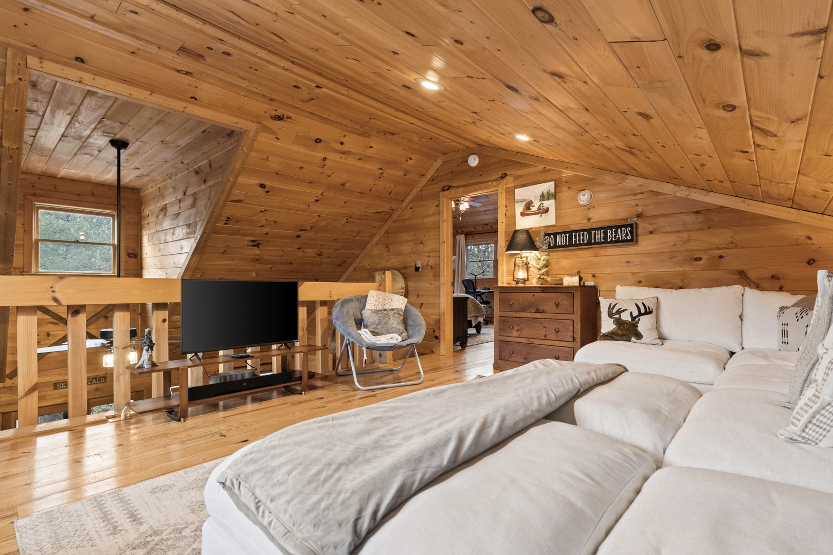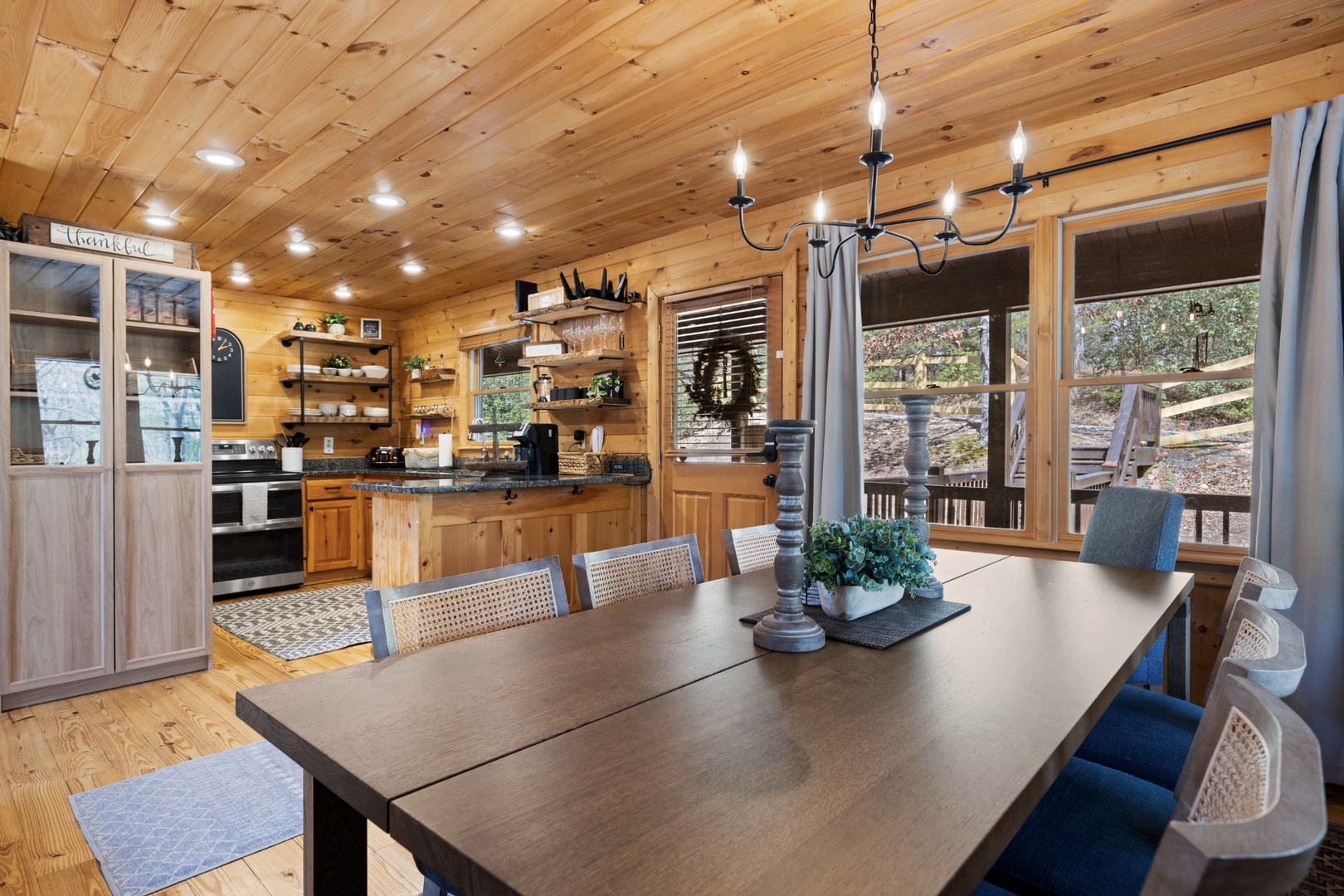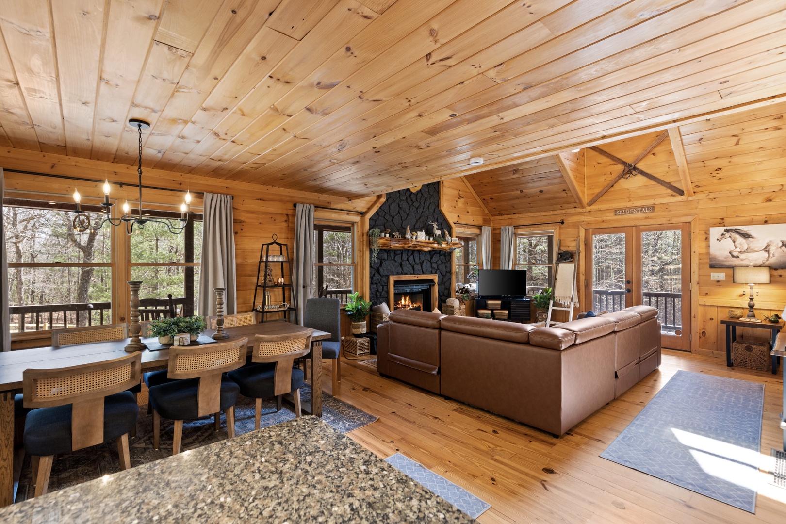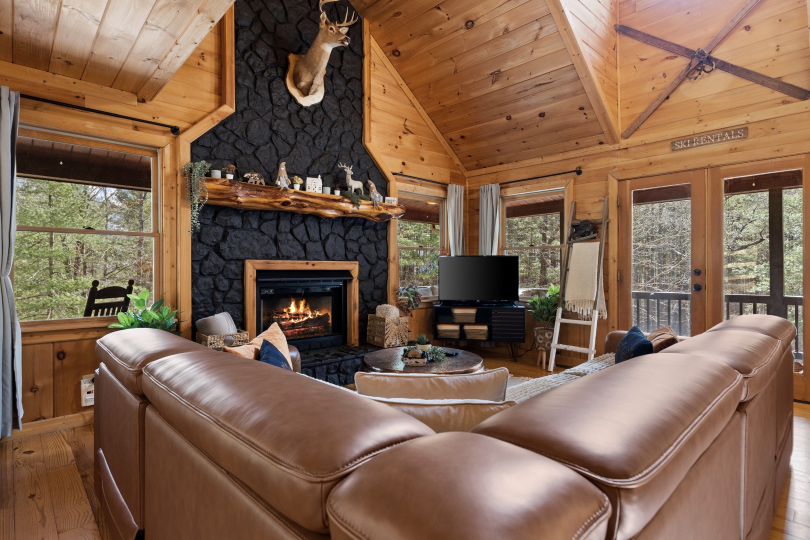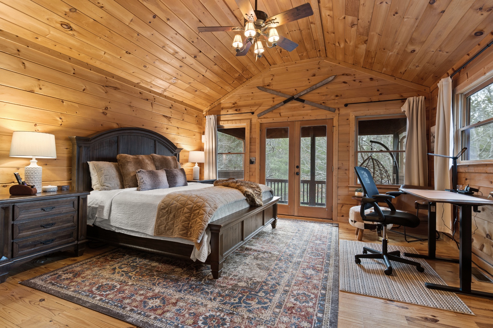 Inside, upscale furnishings and thoughtfully curated spaces create an elevated yet inviting atmosphere. Whether you’re planning a working retreat or simply want room to spread out, this cabin features FOUR dedicated workstations and dual high-speed internet — Starlink plus local service — ensuring a remarkably reliable connection for remote work, streaming, and video calls.
