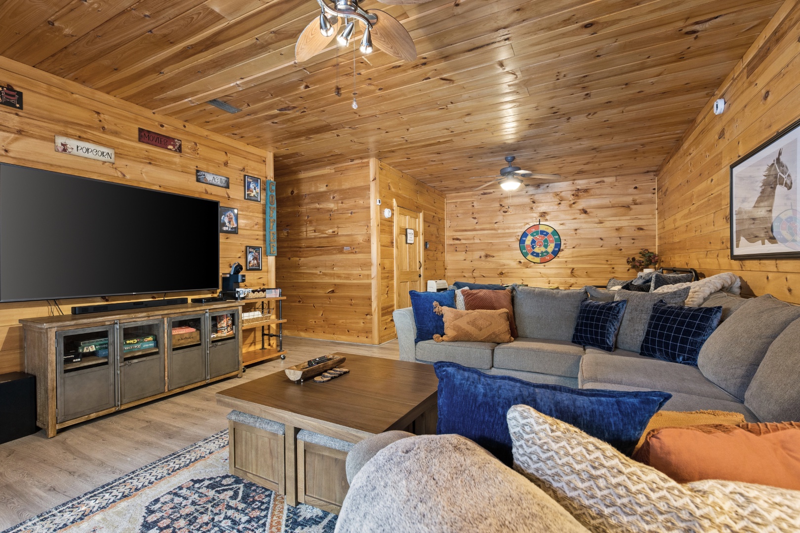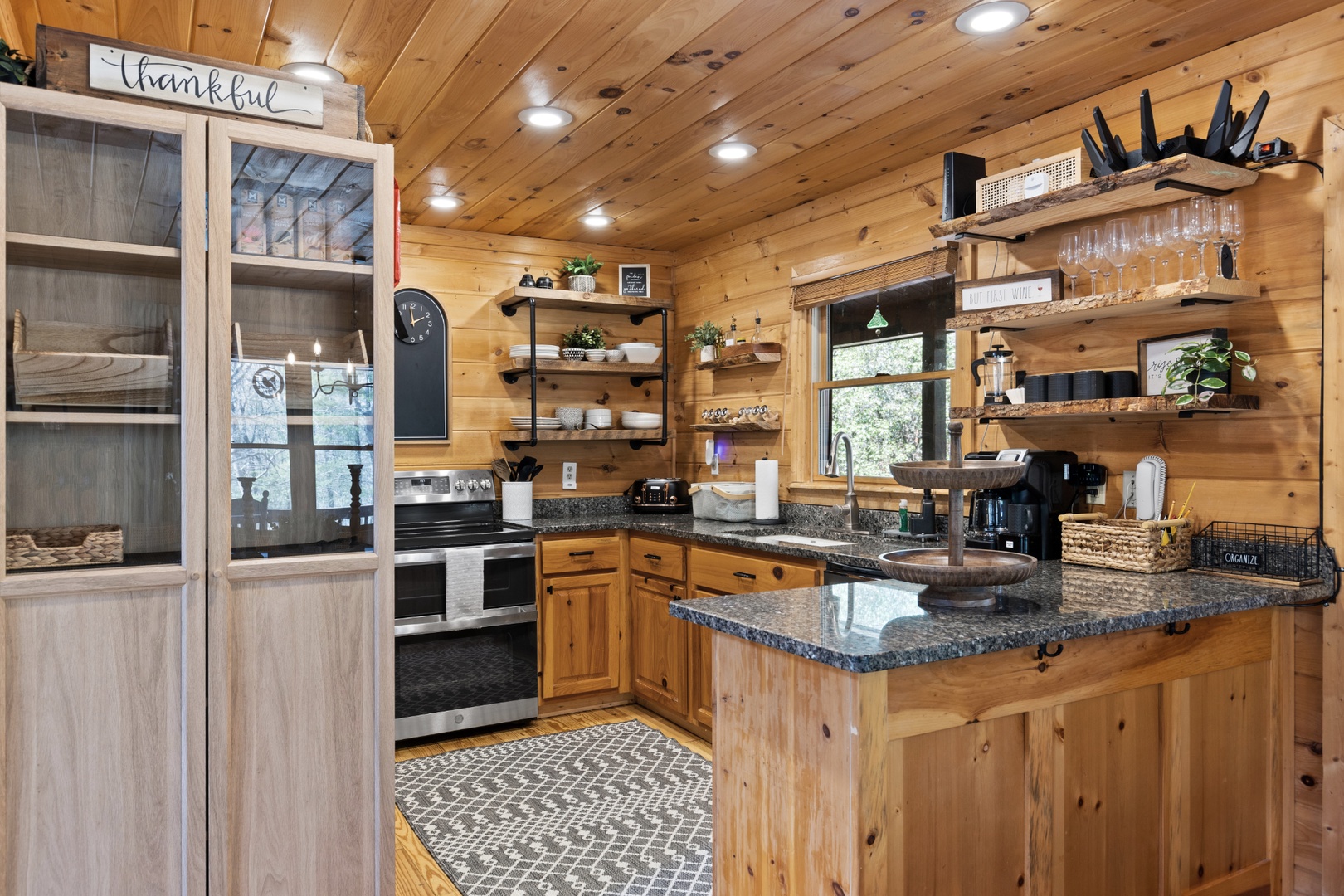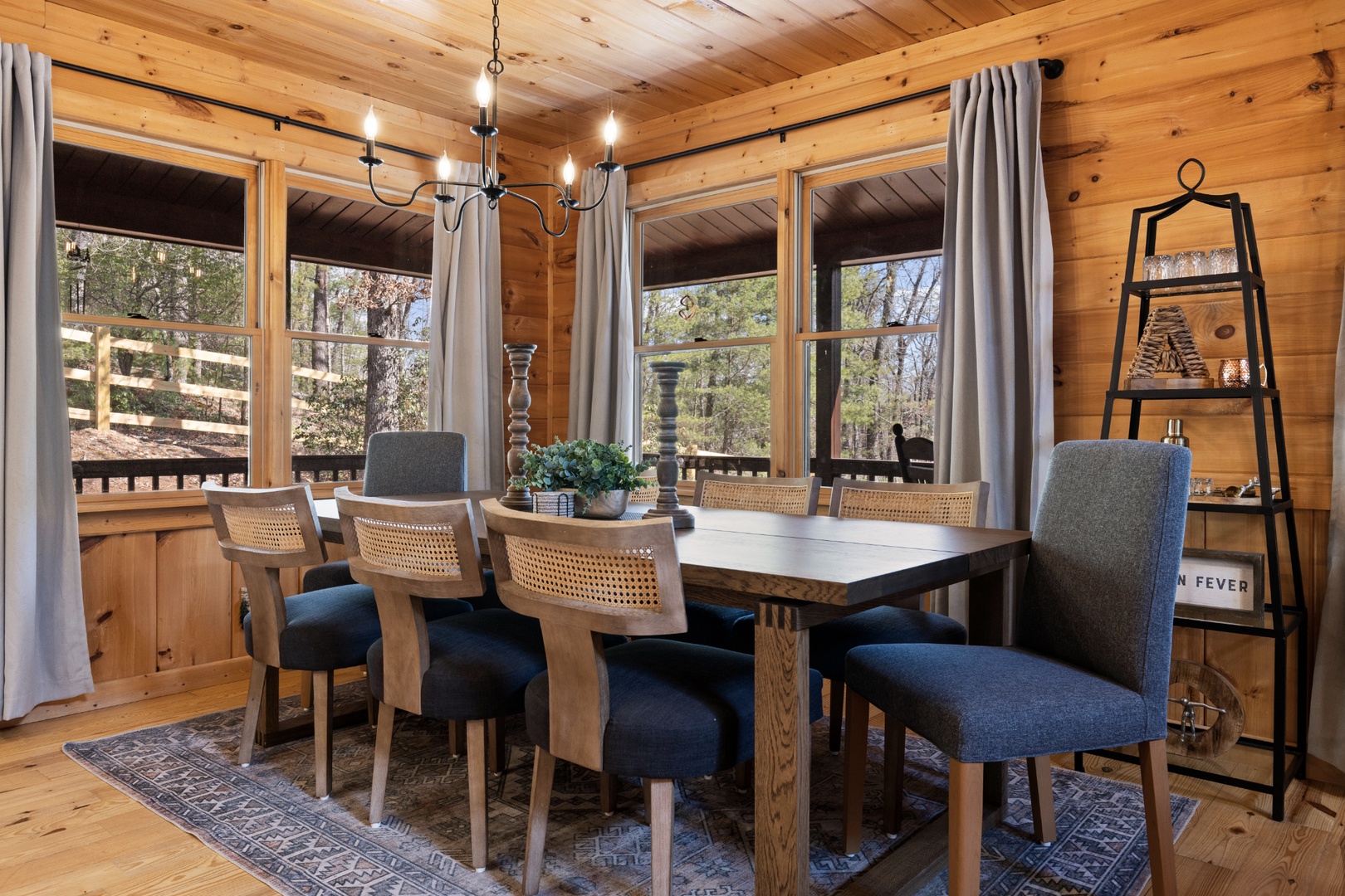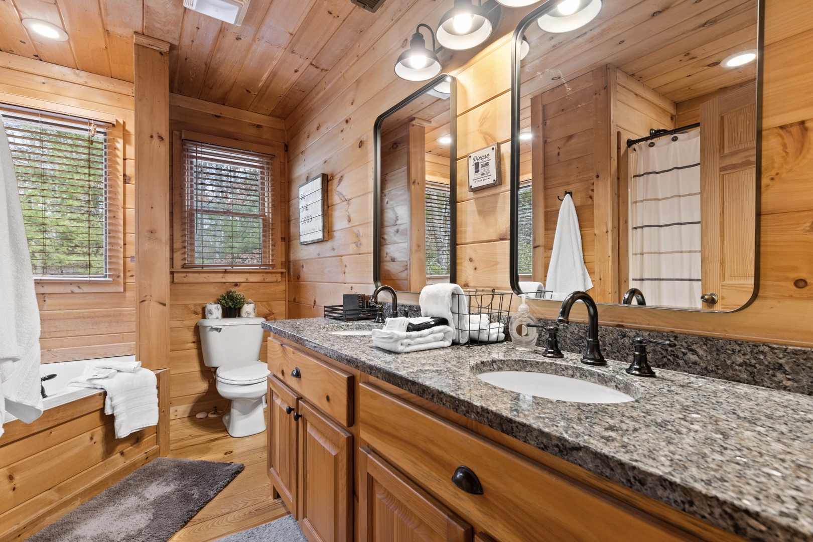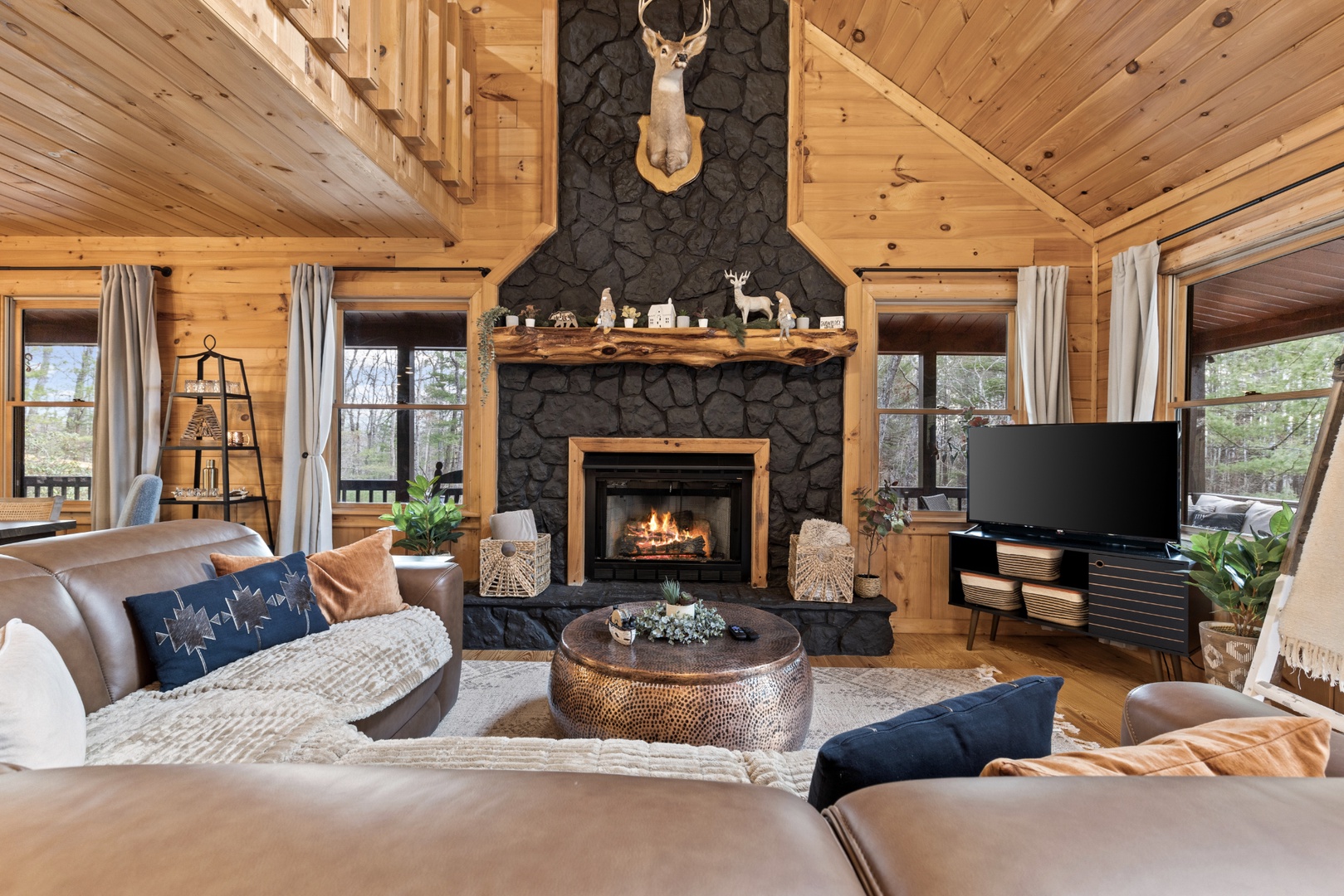 Inside, upscale furnishings and thoughtfully curated spaces create an elevated yet inviting atmosphere. Whether you’re planning a working retreat or simply want room to spread out, this cabin features FOUR dedicated workstations and dual high-speed internet — Starlink plus local service — ensuring a remarkably reliable connection for remote work, streaming, and video calls.