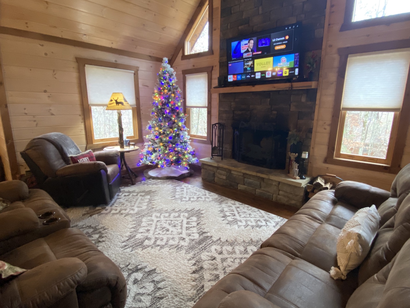 Escape to this modern mountain cabin just 5 minutes from Blue Ridge, GA. Enjoy privacy and luxury with a hot tub, multi-game table (air hockey, pool, ping pong), wood-burning and gas fireplaces, outdoor fire pit, and a screened porch with dining and lounging areas. The perfect spot for a peaceful getaway.
