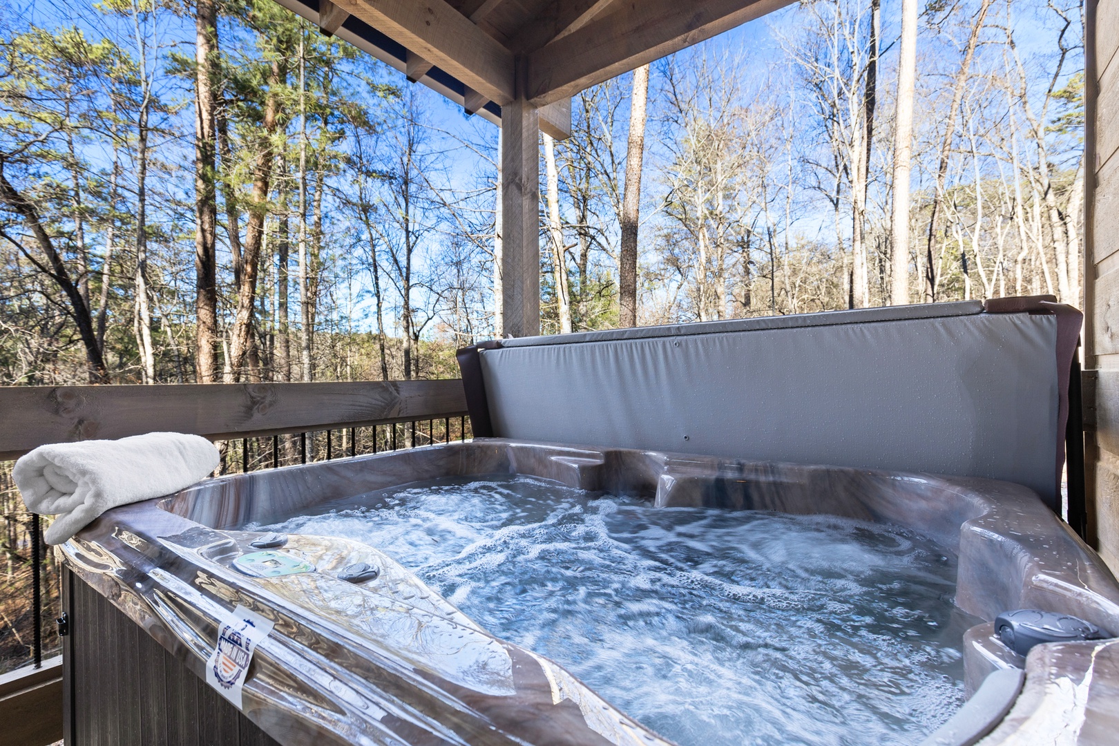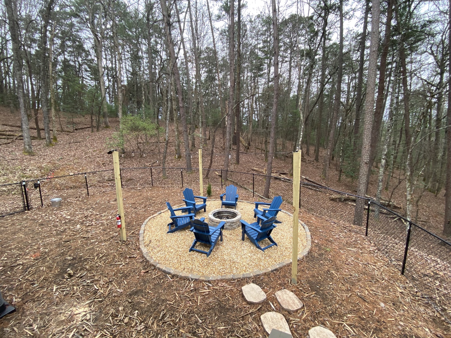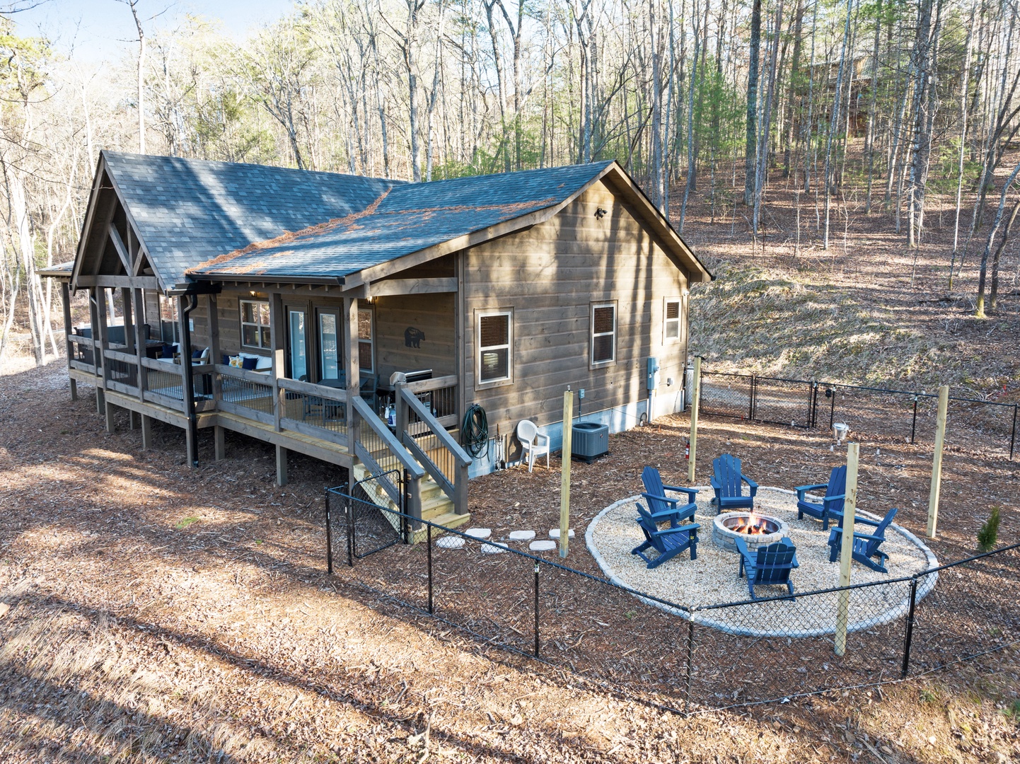 Inside, you’ll find two comfortable bedrooms and two full baths, plus a cozy gas-log fireplace for cool mountain evenings. Step outside to soak in the hot tub, gather around the fire pit, or let your pups roam the fenced yard. This pet-friendly cabin goes the extra mile with dog beds, bowls, and special throws provided for the furniture.